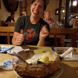 After BMW we caught the subway back to the hotel. We had been told by tour guide and friends to go to the Augsteiner beer house so we found it on Google and started to walk. We found a restaurant that had the Augsteiner logo out in front of it. This was not what we were looking for but we ate here. The food was great but it wasn’t the beer house we’d been searching for. We went back to the hotel and cleaned up and then set out to find the Augsteiner Beer house. We found it! Devin ordered her Bavarian favorite, Radler, beer mixed with lemonade. I ordered a liter of dark beer. Devin also got us a blueberry pancake with ice cream.
