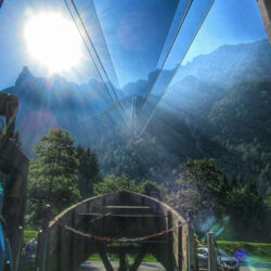 Along the way to the base of Karwendel we crossed over the Isar River. The same river that the surfers got their water from in Munich.The tram up was packed. It cost 26.50€ per person for a round trip ticket. Some people buy a one way ticket and walk down or vice-verse. The tram was a little late taking off and the operator probably explained why in German but we didn’t understand. Regardless the look of panic and fear is universal and I did not see it on anyone’s face.