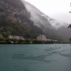 It was bound to happen sooner or later, rain. We knew we had a chance for rain all day today so our plan was to wander the town of Interlaken instead of ascending a mountain. Solid plan as the mountains are covered in clouds today but the light drizzle predicted by the weather app is more of a steady and chilly thing. We made it about a tenth of a mile to the dam and then choose to return to the warm and dry apartment (thank you Airbnb).