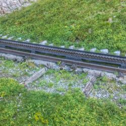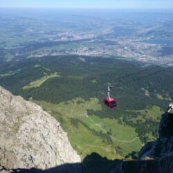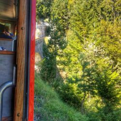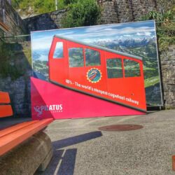 The boat ride was nice but it was long (90 min). In retrospect we might have skipped the boat or done the path in reverse. We got off at Alpnachstad and got our pass for the the Pilatus railway. This is the worlds steepest railway in the world. In writing this post I just read that Wikipedia article. If I had seen the phrase The line still uses original rack rails that are now over 100 years old I might not have gone.
