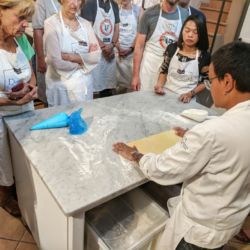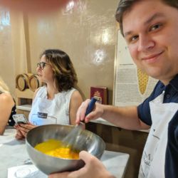 After the market tour we were lead to a cooking classroom behind the market. Our instructors were excellent and laid the ground rules for the class to come. Our first task was to make tiramisu. I showed off my skills by mixing the egg yokes and sugar with the mascarpone. Everyone gave me compliments but Linda wasn’t buying my feats of strength. Assembly of the tiramisu was simple but the woman to my left had the sudden realization that this wasn’t cooked and there were raw eggs. The chefs assured her that they were fine. I often forget that raw eggs make people nervous.