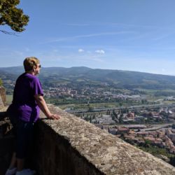 This super fancy incline train took us up the side of the steep cliff and dropped us off near a fortress. There was a crowd of people waiting to board a bus. At this point we didn’t know where the bus went but we knew for sure we didn’t want crowds. We walked past them into a blissful people free zone. Yes, as a matter of fact, we were peopled out after visiting the touristy areas of Rome.