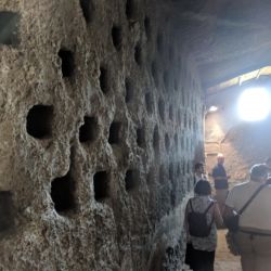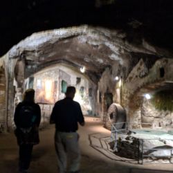 Descending a few more stairs, we reached a cool tunnel / column network. Our guide explained to us that the original inhabitants mined the caves for fancy powder (pozzolana) used to make concrete as well as blocks to build their homes. You could legit touch the wall and you hand came away dusty with the concrete powder! This mining was all done by hand and you could see the pick-axe marks in the walls and ceiling.