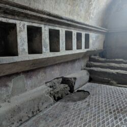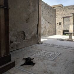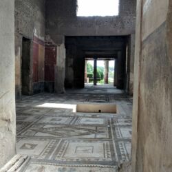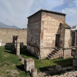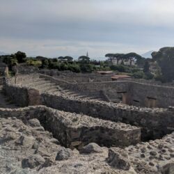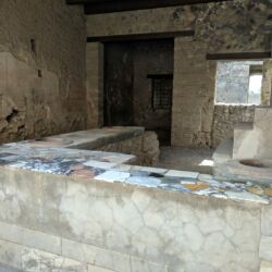 - This street was one of the primary shopping areas of Pompeii. The experts know this because they had fancy sliding doors to close their shops off at the end of the day. You can look at the base of the doorways and see the groove where the door slid along. The stores were on the ground floor and the family lived above the shop. This was likely an early version of “business in the front and party in the back”.