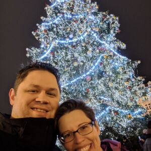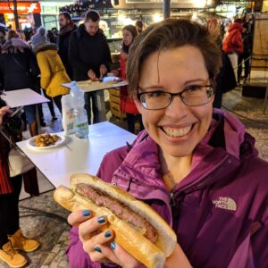 There are so many stands for Trdelnik or chimney bread and even though we knew that it is not traditional Czech food we had to try it. While it looks very cool it isn’t worth the money. The lights and the tree were very pretty and we got some mulled wine and apple cider. The mulled wine was very pungent and hard to drink without making a face.