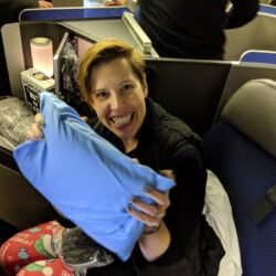 As a Christmas present to ourselves we purchased business class tickets for our flights. Our United 777 had the lie flat beds with pretty good privacy. The welcome package on our seats had 2 blankets, 2 pillows, and a kit with lotions and balms. Devin was excited by the pillow and wanted to know if we could take it. According to the business class code of conduct manual this is frowned upon.
