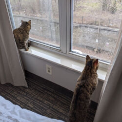 We had to make several trips back and forth from the van to get all the cats and their stuff. It felt like we had kids until we remembered that we would not be able to lock a child up in a animal carrier and leave them in either the van or the hotel room by themselves.