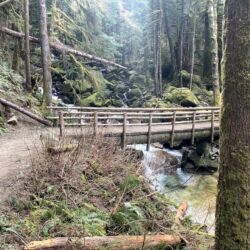 Right off the parking lot is a beautiful arch walking bridge over the Middle Fork of the Snoqualmie river. Here is where we saw the signs about the trail closure. We ignored the signs initially but suddenly realized we’d forgotten to display the pass in our car. The second time out we decided not to tempt fate and take a right where the Pratt River Trail starts. The trail is 12.2 miles which is longer than we are currently capable of – Gonna work on that.