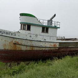 We ended up having Taco Time for dinner. Not bad but certainly not the pub food I’d been planning on. Ah well. At least the campsite was fun to explore. I got to wave through the mist at Canada and they had an old boat just hanging out between campsites.