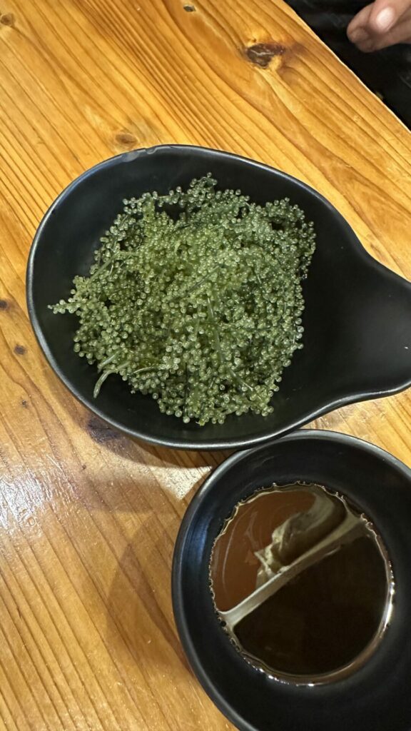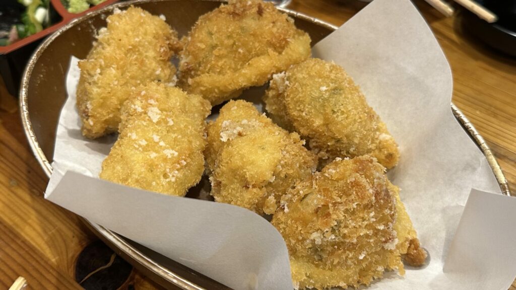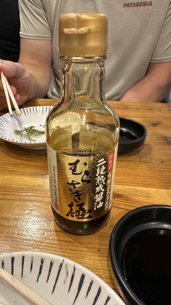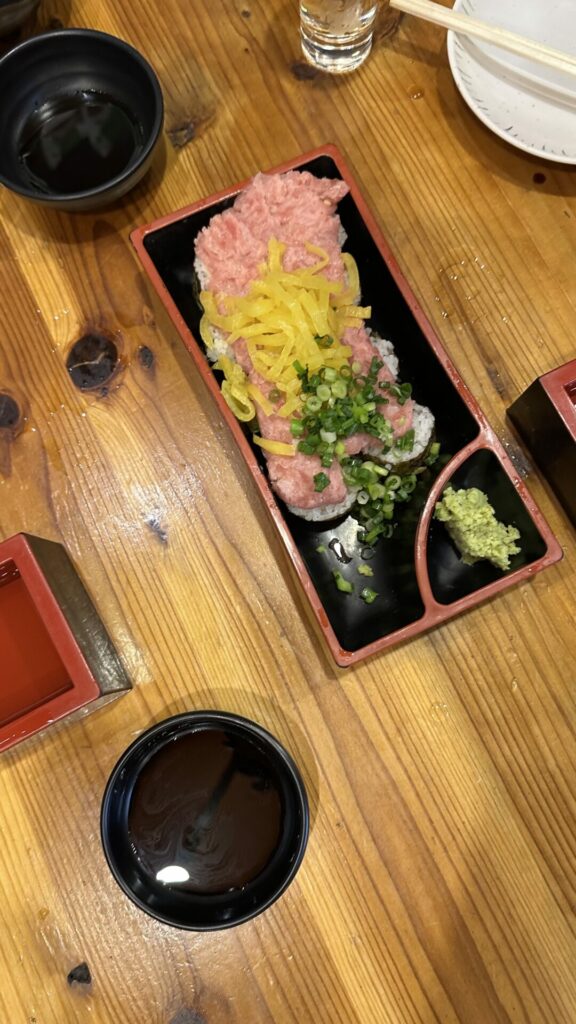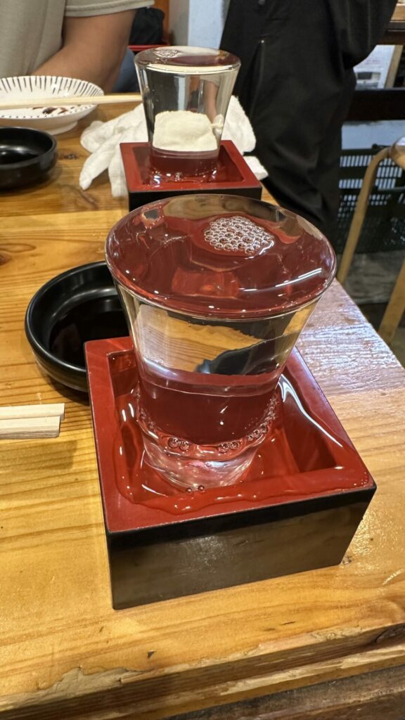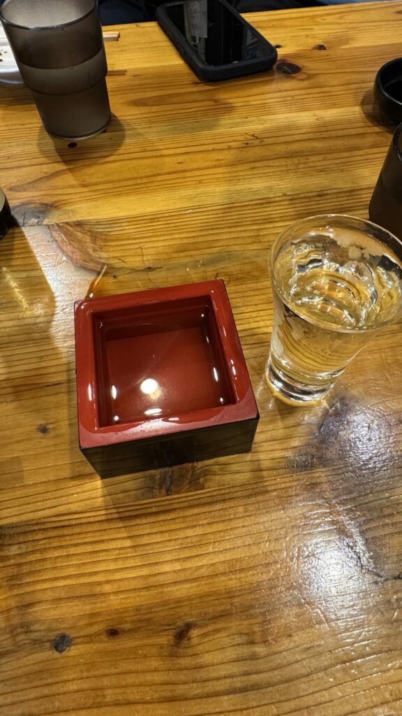 Next, we headed to an Izakaya specializing in seafood called Takamarusengyoten 2. Before the food, we received a helping of sake served in a shot glass in a small wooden box. The sake is poured into the shot glass so that it overflows into the box until the box is full. The wooden box is called a masu, which during its feudal period, was used to measure rice. The tradition of overflowing the sake into the box symbolizes the generosity of the server. The sake was excellent.