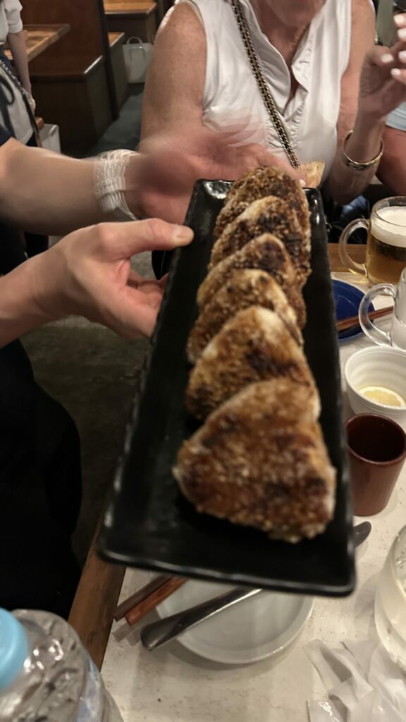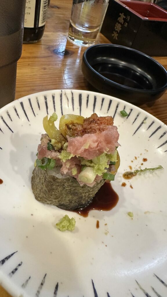 For food, we were served tuna sushi, karaage (fried chicken), crab cakes, and salmon and tuna sashimi. There is no meal quite like one with good sake, salty, and umami-flavored foods.