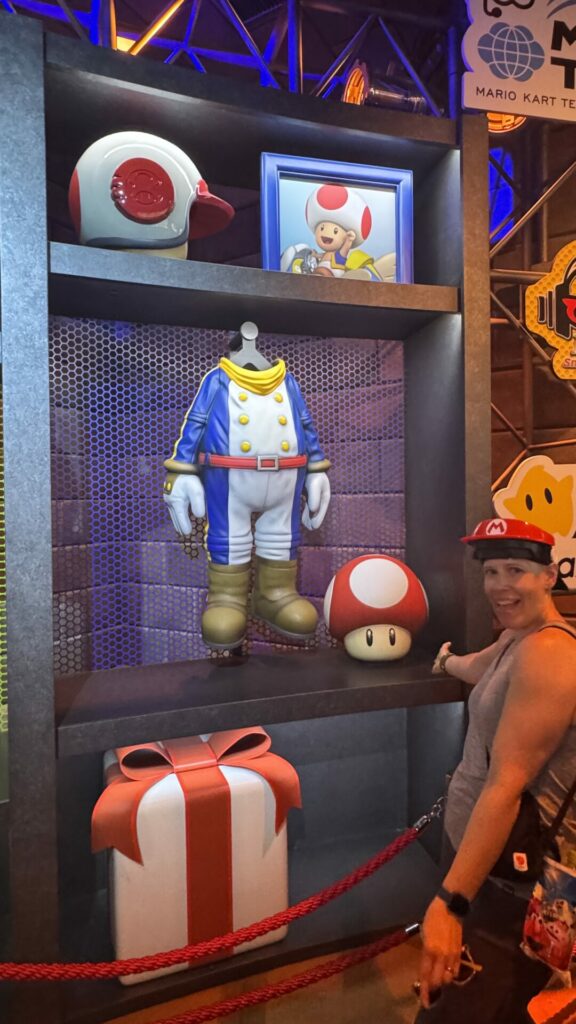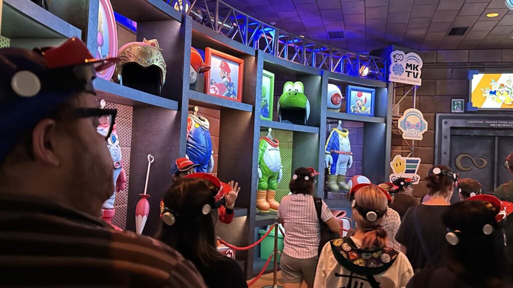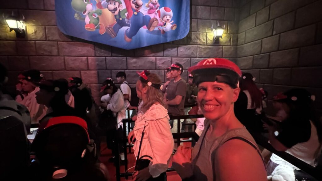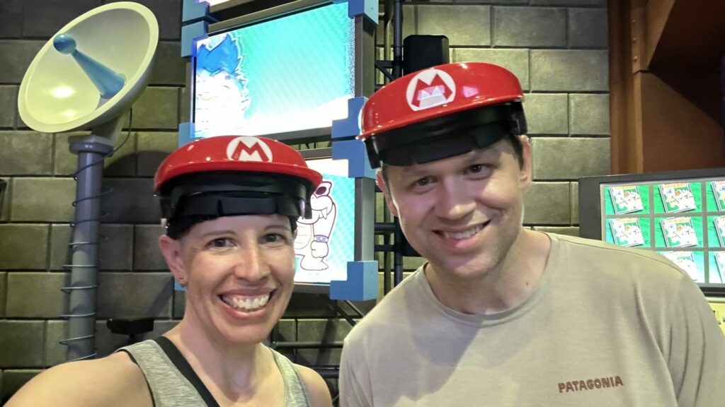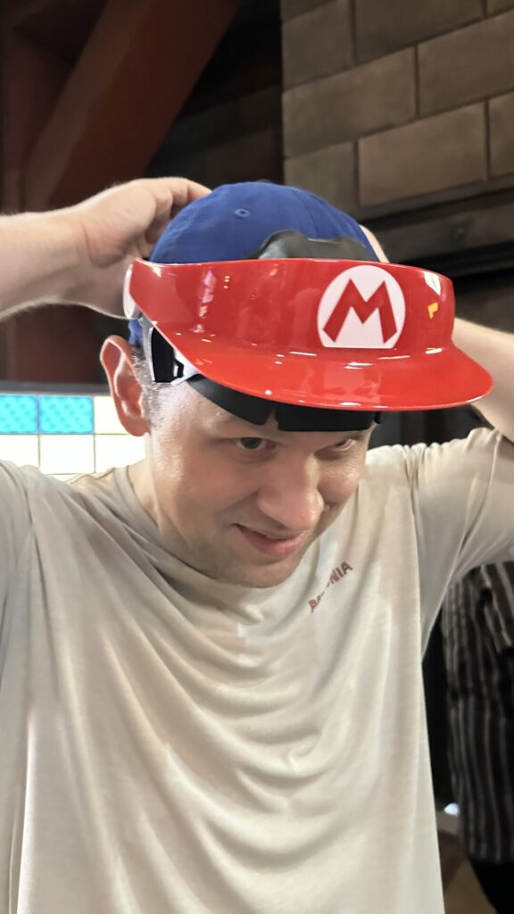 After that, it was straight on to the first ride: Mario Kart: Koopa’s Challenge. I did zero research on the various rides in the park, let alone Super Nintendo World. Chris, on the other hand, was extremely excited for this ride because of the technology involved. Everyone receives fancy, adjustable Mario hats. We wear them while standing in line. This isn’t the cool part because let’s face it, there are cooler Mario hats available in the gift shop.