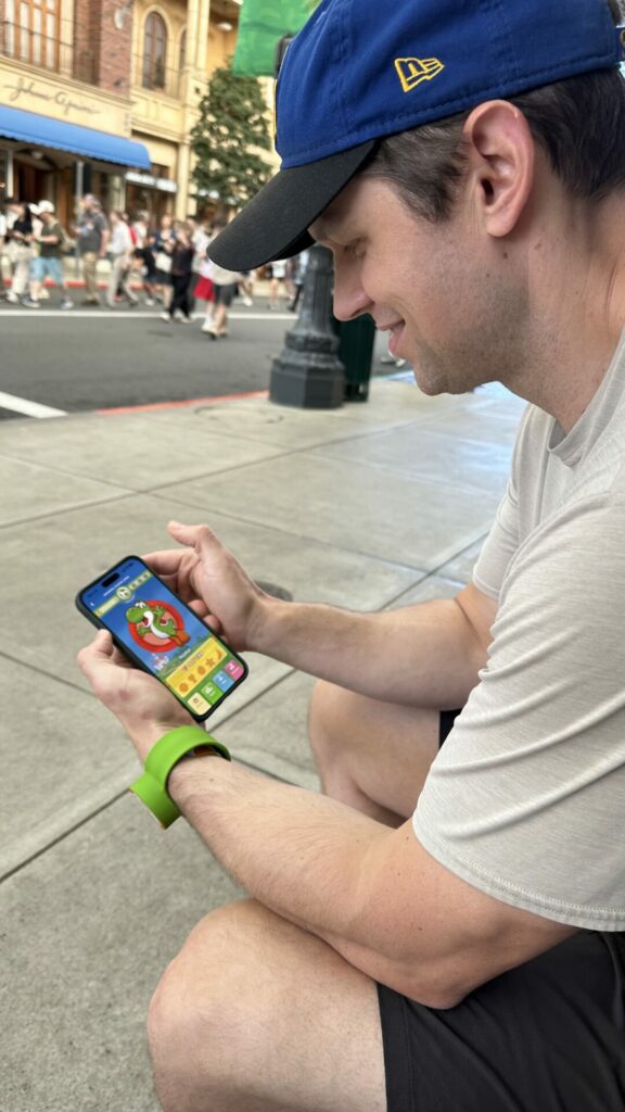 We eventually made it to the gates and entered the park. It was around 8:30, and our first reservation wasn’t until 9:40, so I proposed we head to the gift shop and get our fancy Nintendo bands for later. This was a mistake of sorts. They are great fun when you’re in Super Nintendo World, but other than that? They’re awkward and plasticy. It was a hot day (high of 86 – don’t laugh Southerners!) and there isn’t a ton of shade in the park. We didn’t enjoy wearing them and often stuck them in my bag to give our wrists a break.