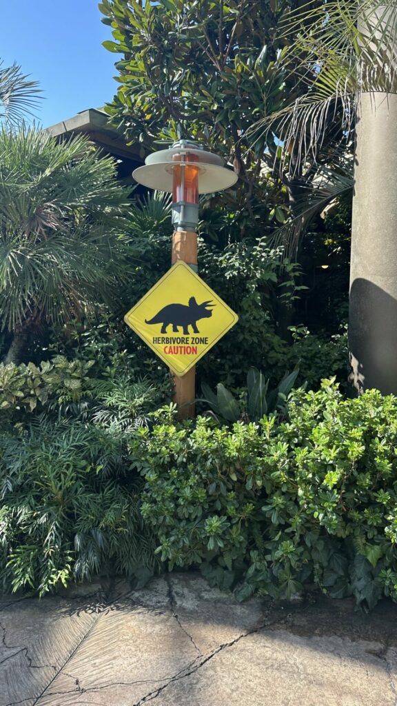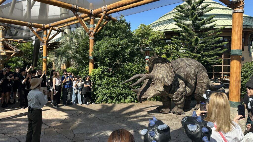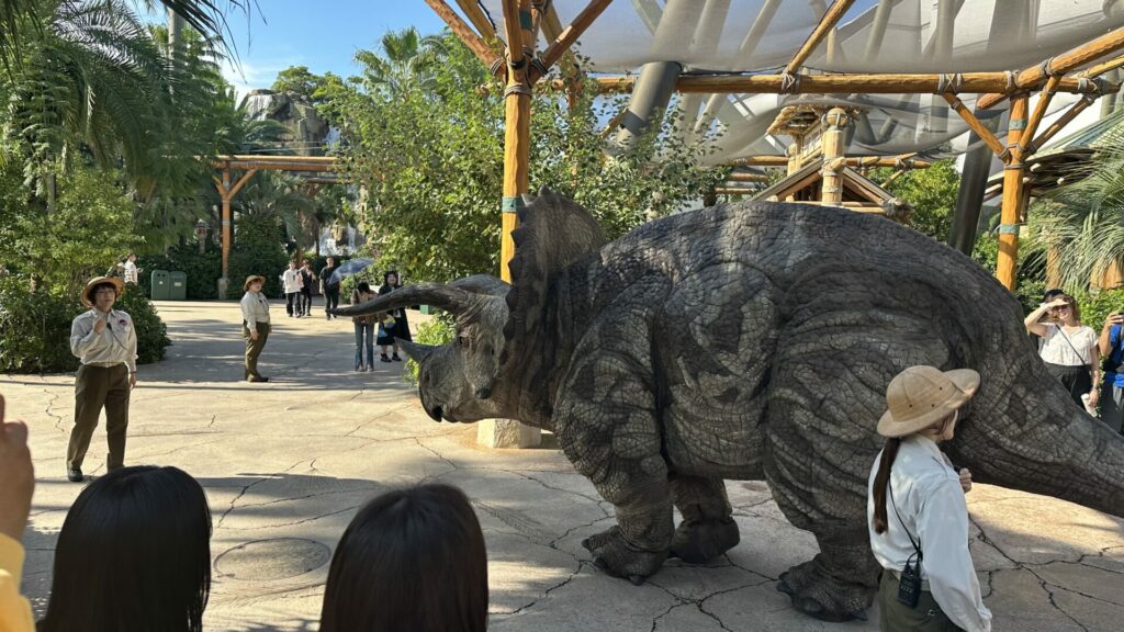 We entered Jurassic Park and traffic was immediately stopped for a triceratops crossing the road. Why was it crossing the road? To get to the meet and greet, obviously.
