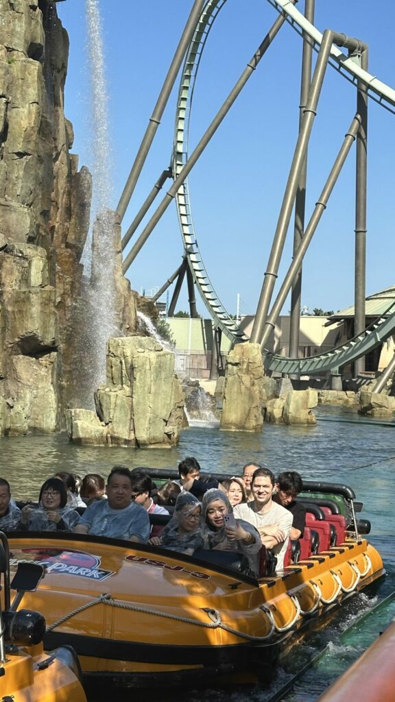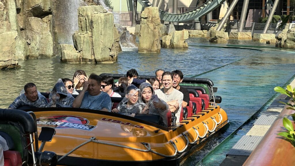 The first ride we came across was Jurassic Park – The Ride. We got into the Single Riders line, which had half the wait time as the regular line, and off we went. It’s fine if you have time to kill and/or want to get wet. The best part is the T Rex at the end, just before you splash down the hill. I got a bit damp. Chris was sitting closer to the front and got soaked.