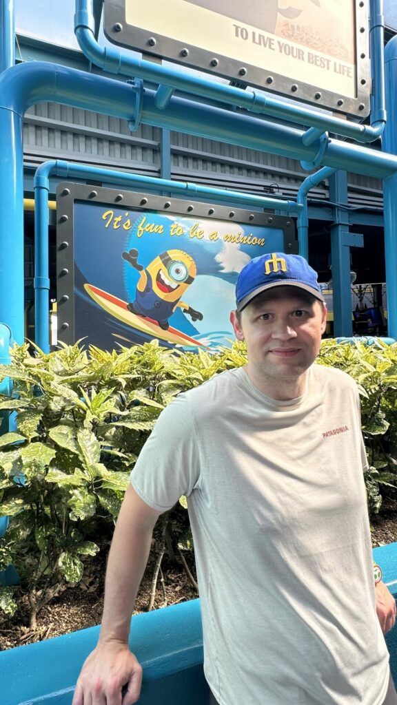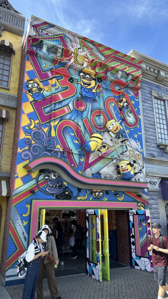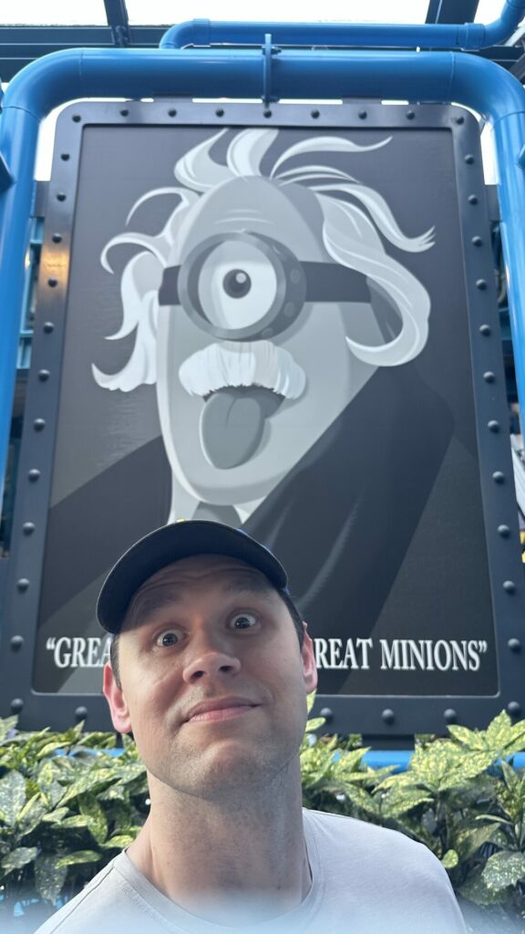 We went on the ride Despicable Me: Minion Mayhem. It’s one of those sit in a mostly stationary car and watch a huge video screen while the car jerks around to simulate movement rides. We were promised banana scent. My nose has been broken of late (I smell smoke when there is none), so all I smelled was burnt rubber. The ride was fun tho.