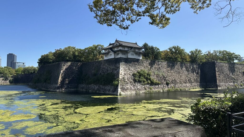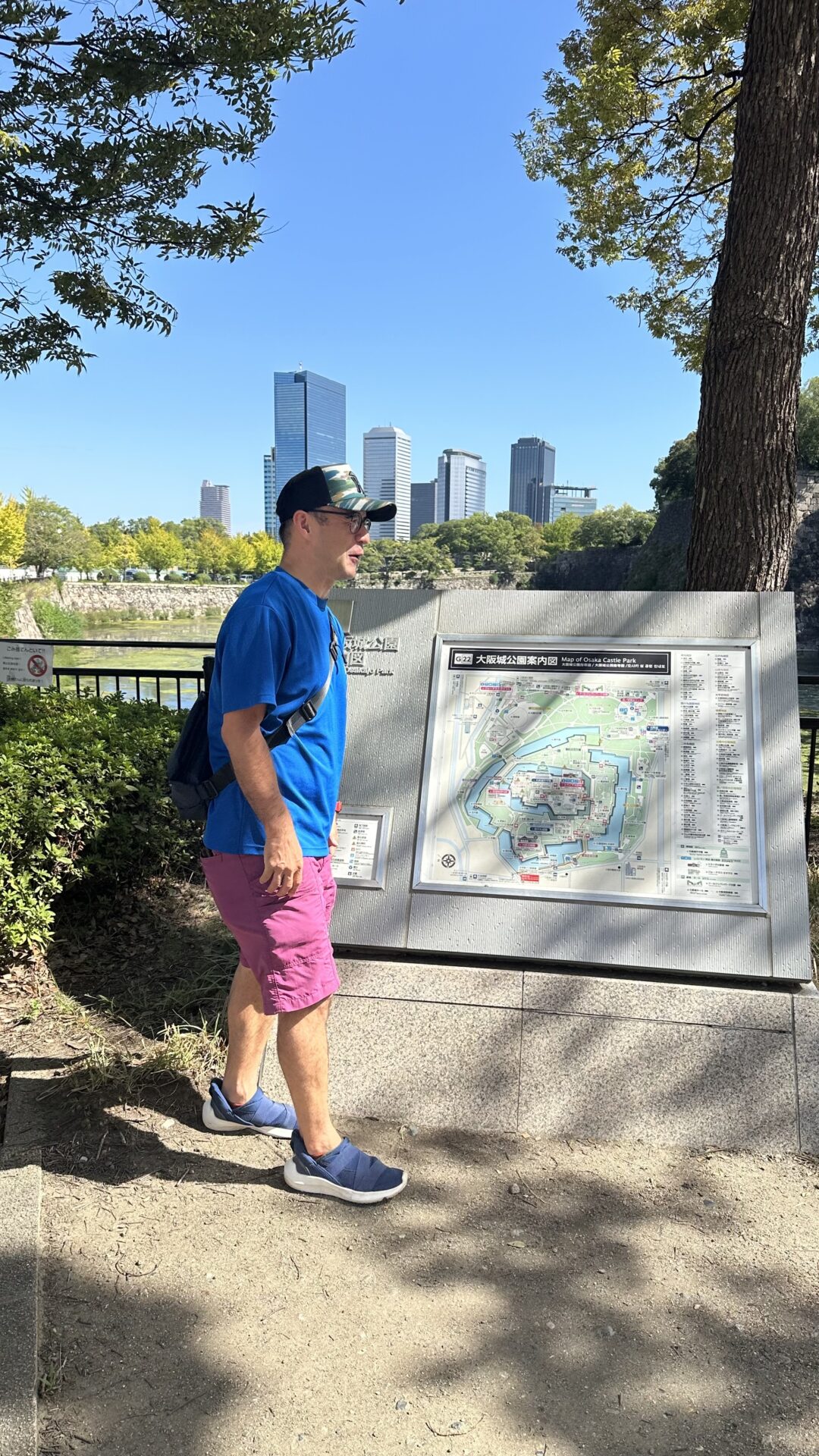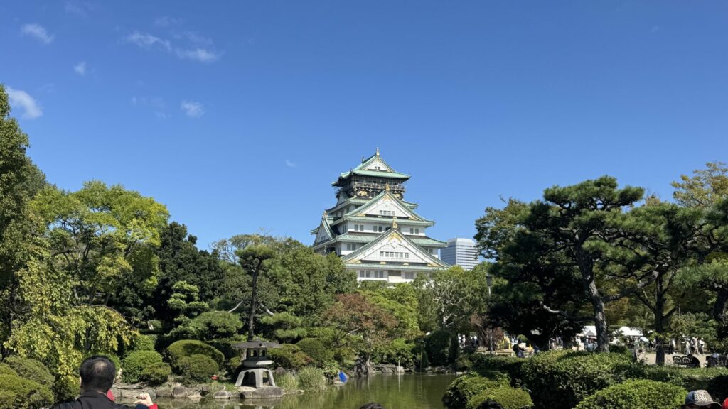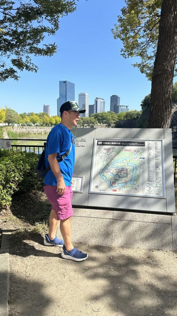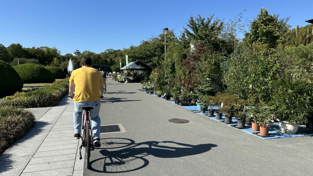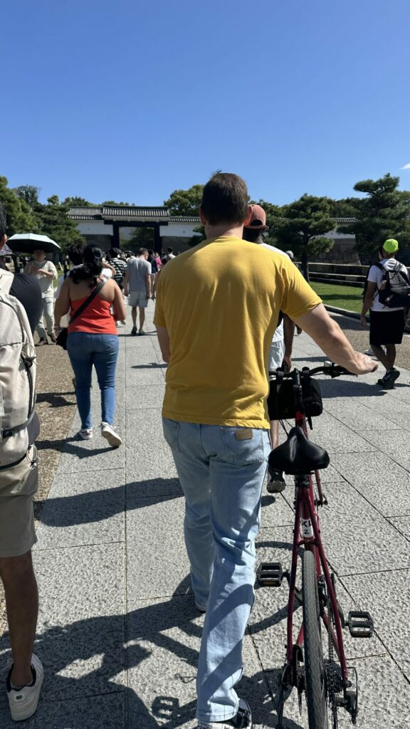 Back on our bikes, we headed for Osaka Castle and biked our way through tourist central to get a glimpse of the castle. The castle played an important role in the unification of Japan during the 16th century, but there was no food here.