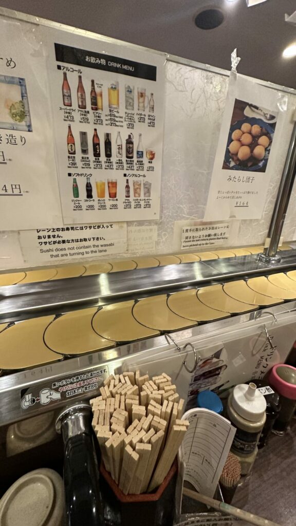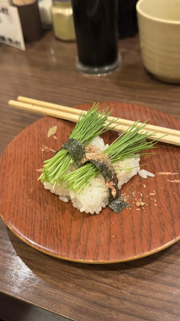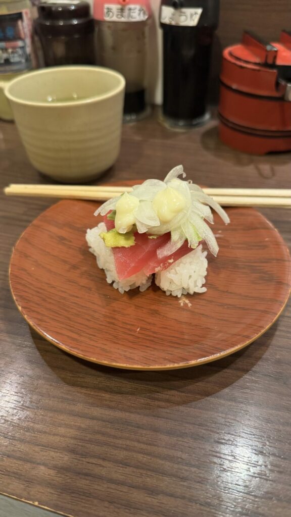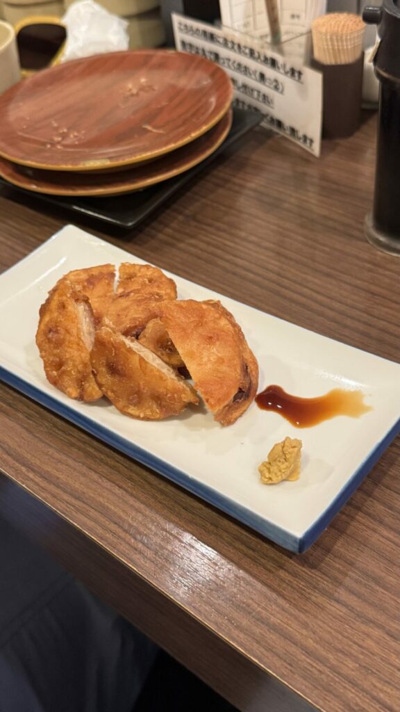 More biking through side streets and main streets, we ended up at a sushi restaurant. Also, right across the road from another train station. It was a conveyor belt sushi restaurant, but the belt no longer carries sushi. It just runs with plates of pictures of sushi. Here we sampled soft tofu with pickled plum, nigiri, and fried lotus root with pork. Everything was excellent, although Devin wasn’t into the pickled plum on the tofu.