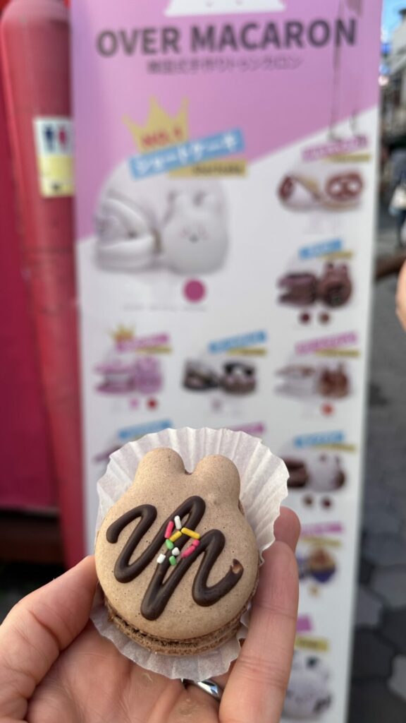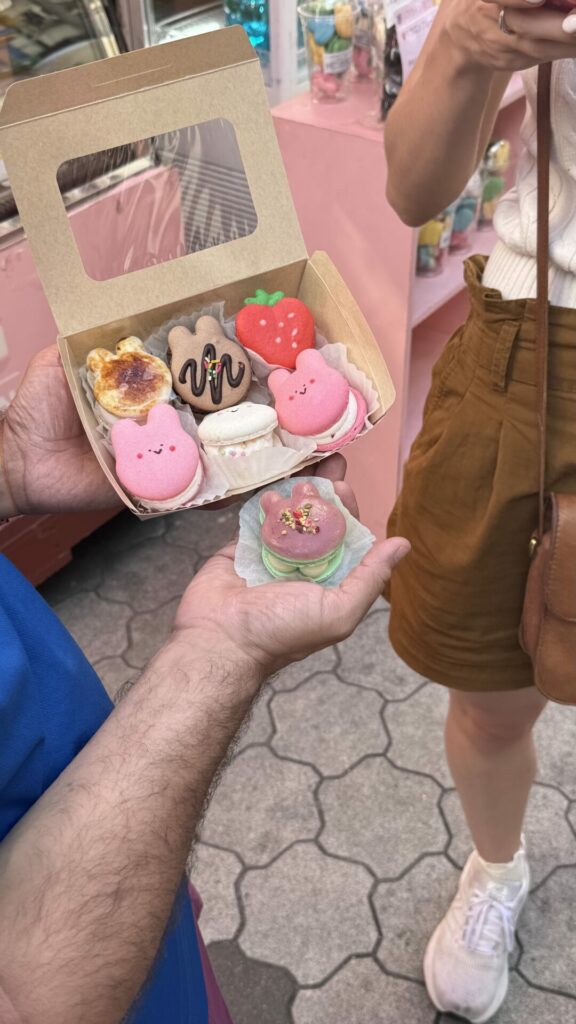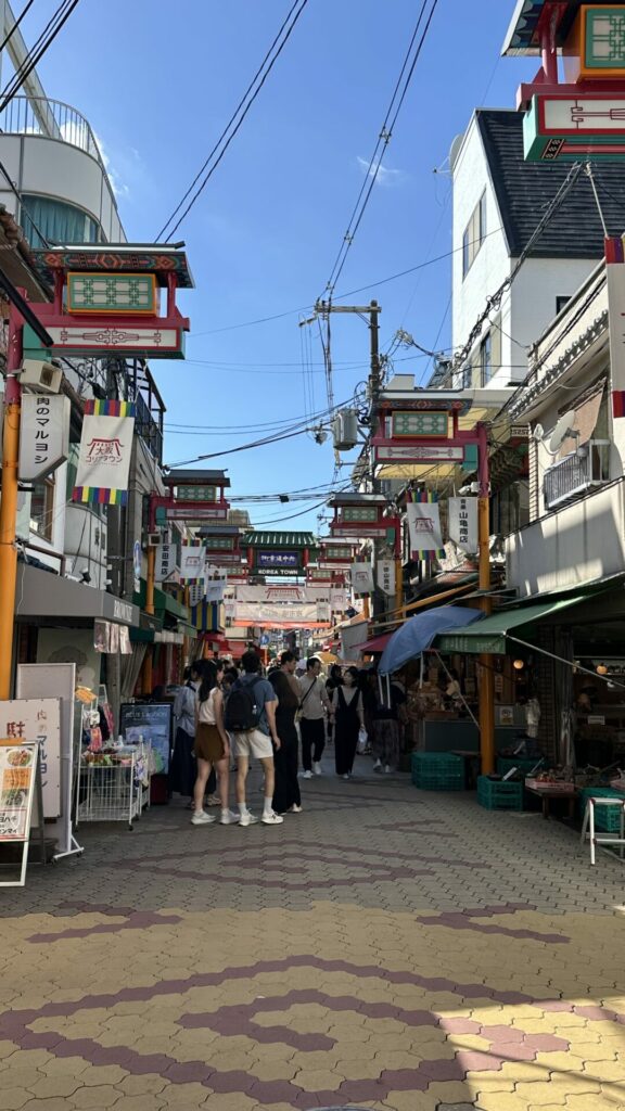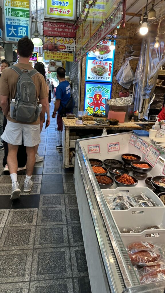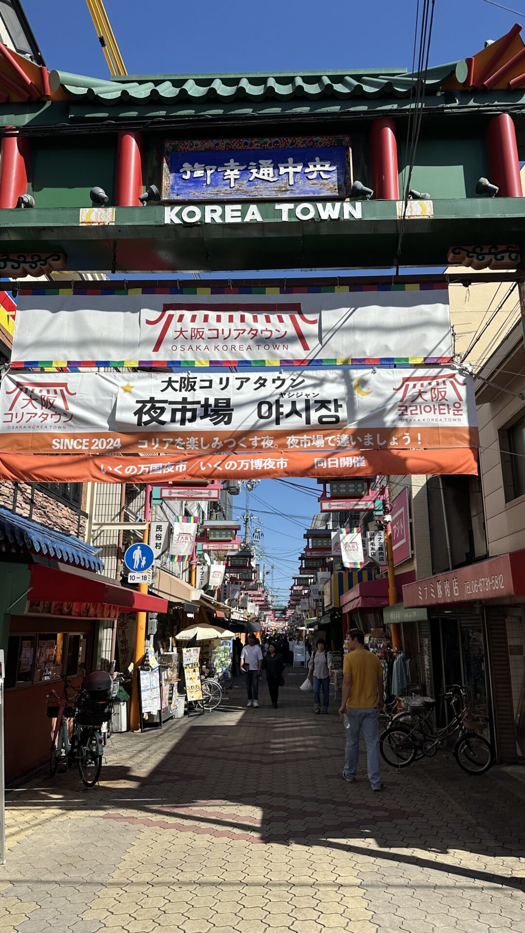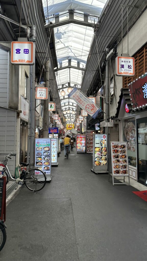 Korea Town was our next stop. Since Japan’s occupation of Korea in the 1920s and the forced relocation of Koreans to support Japan during World War II, Osaka has had a large Korea Town. This area has all our favorite Korean dishes. Danic picks up some savory pancakes and fried chicken. We chow down in a small pocket park and enjoy. On the way back to our bikes, Danic announces that he found room in the budget to get some fancy macaroons that caught his eye. Korea Town was definitely the highlight of the tour. All of the stalls, tiny restaurants, and owners pushing their food were a sensory experience.