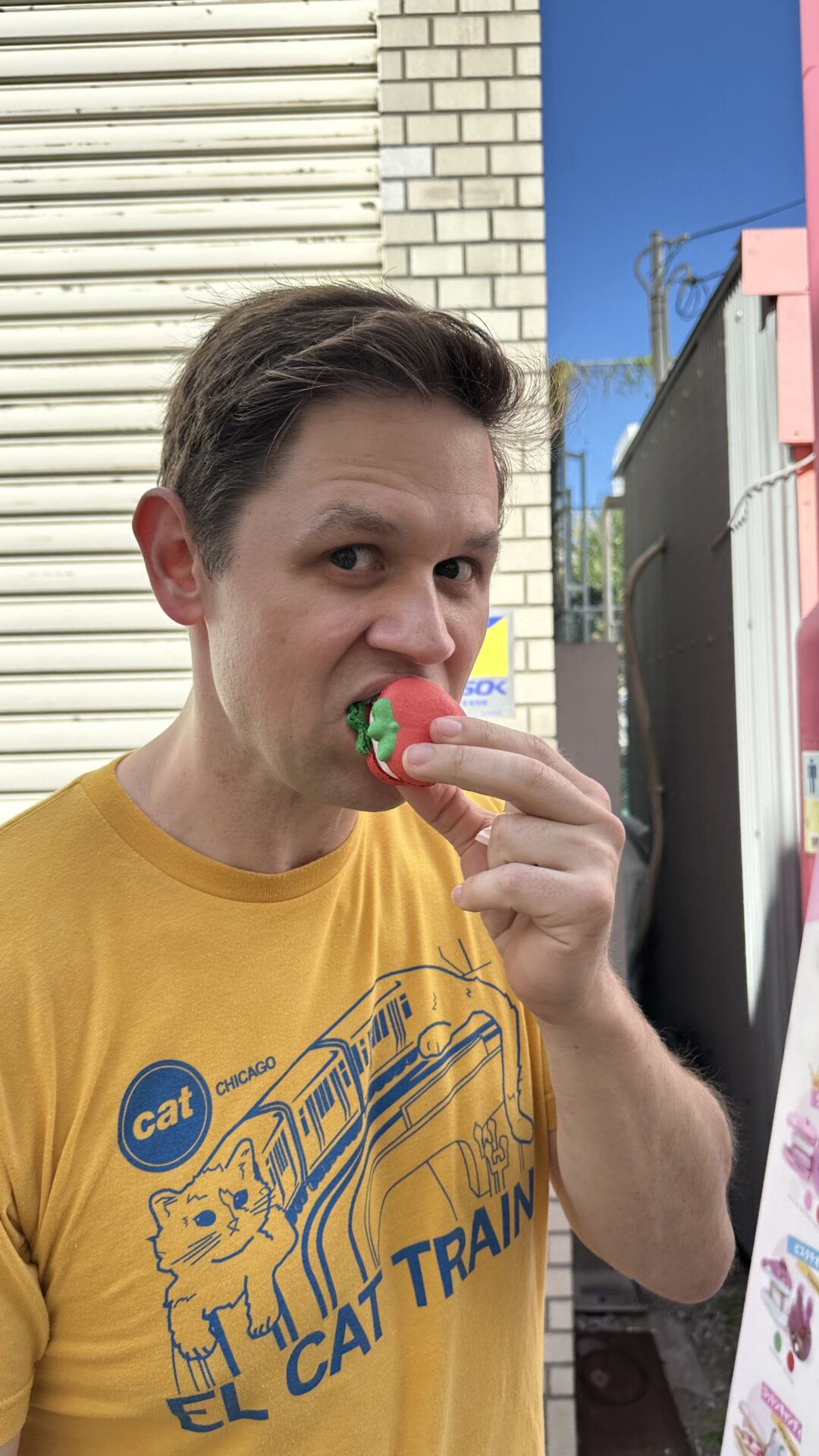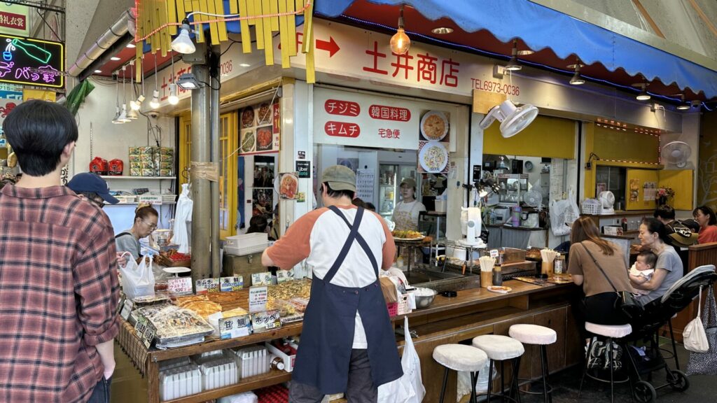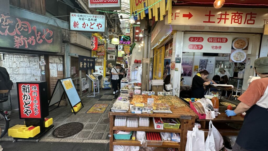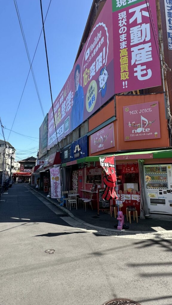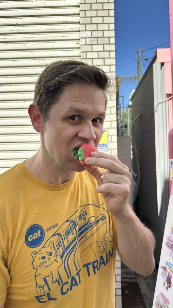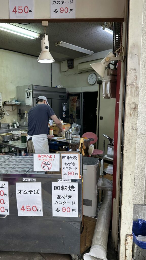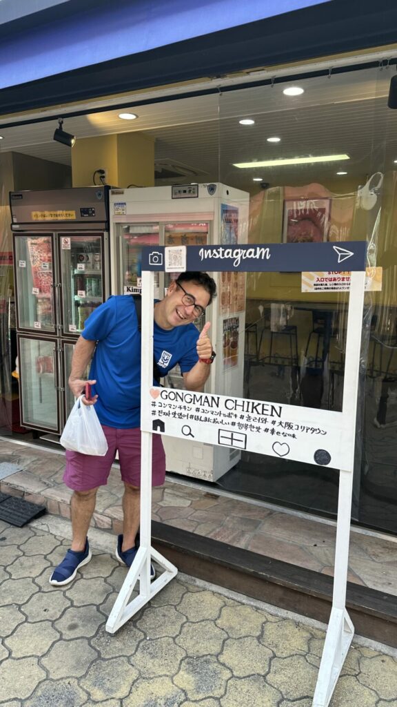 Korea Town was our next stop. Since Japan’s occupation of Korea in the 1920s and the forced relocation of Koreans to support Japan during World War II, Osaka has had a large Korea Town. This area has all our favorite Korean dishes. Danic picks up some savory pancakes and fried chicken. We chow down in a small pocket park and enjoy. On the way back to our bikes, Danic announces that he found room in the budget to get some fancy macaroons that caught his eye. Korea Town was definitely the highlight of the tour. All of the stalls, tiny restaurants, and owners pushing their food were a sensory experience.