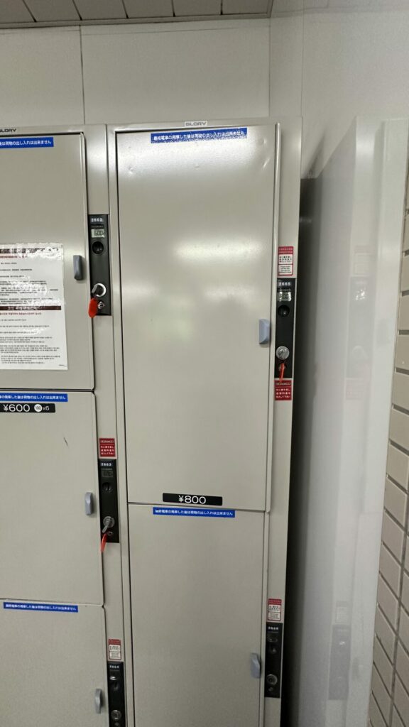 When we arrived at the coin-operated luggage locker, we put our luggage in the locker, looked at the ¥800 price, and then realized it would only accept ¥100 coins. Ugh, we’ve got a lot of coins that total ¥1600, but only 400 in ¥100 coins. Is there a change machine? Nope. Oh, there’s a konbini, maybe they can make change. Nope, their cash registers won’t let them. Devin and I made individual purchases to break ¥1,000 notes to get the other 400 in ¥100 coins. Are we late now? Nope, our collective fear of being late means that we have time to spare.