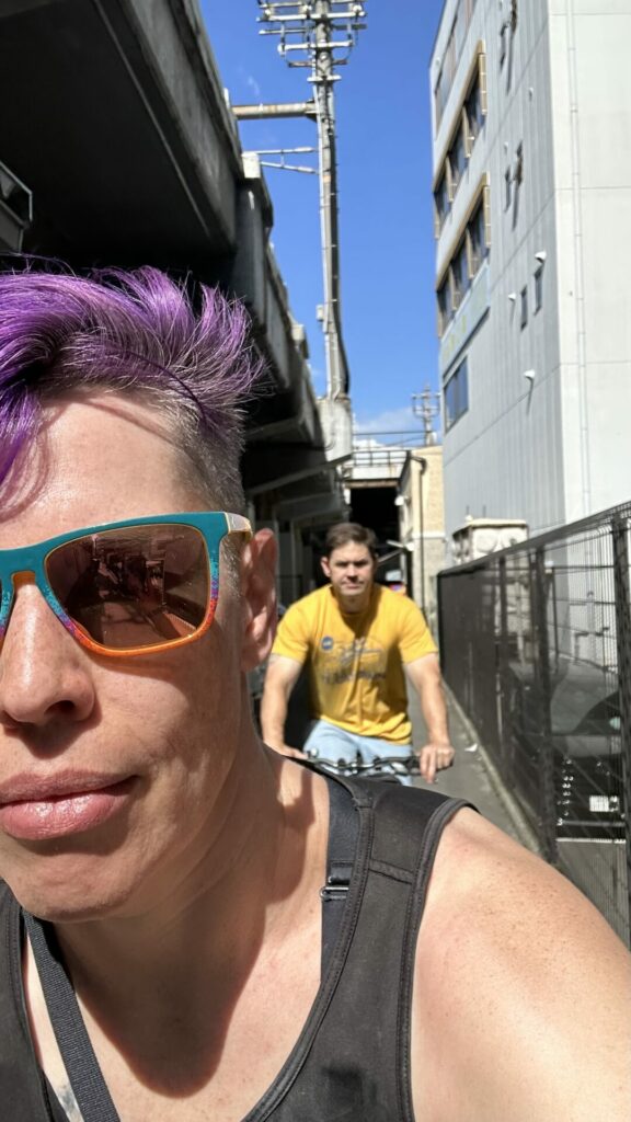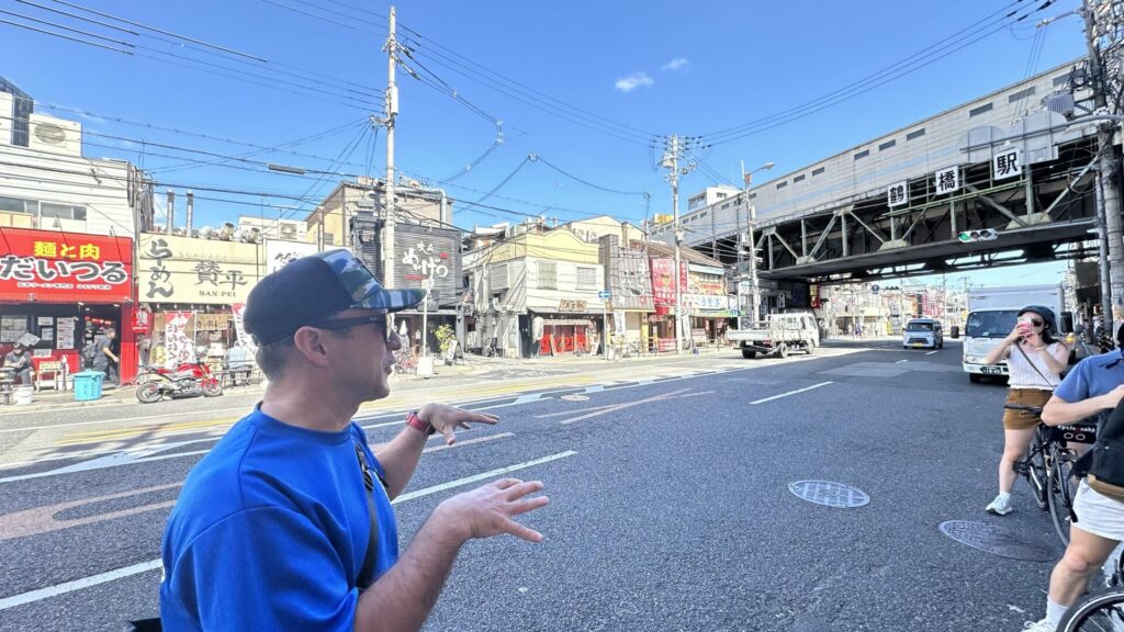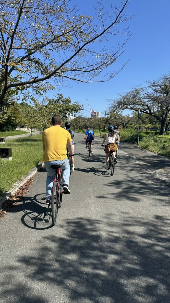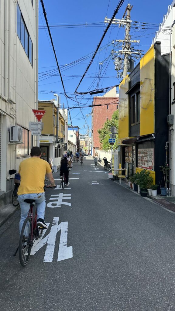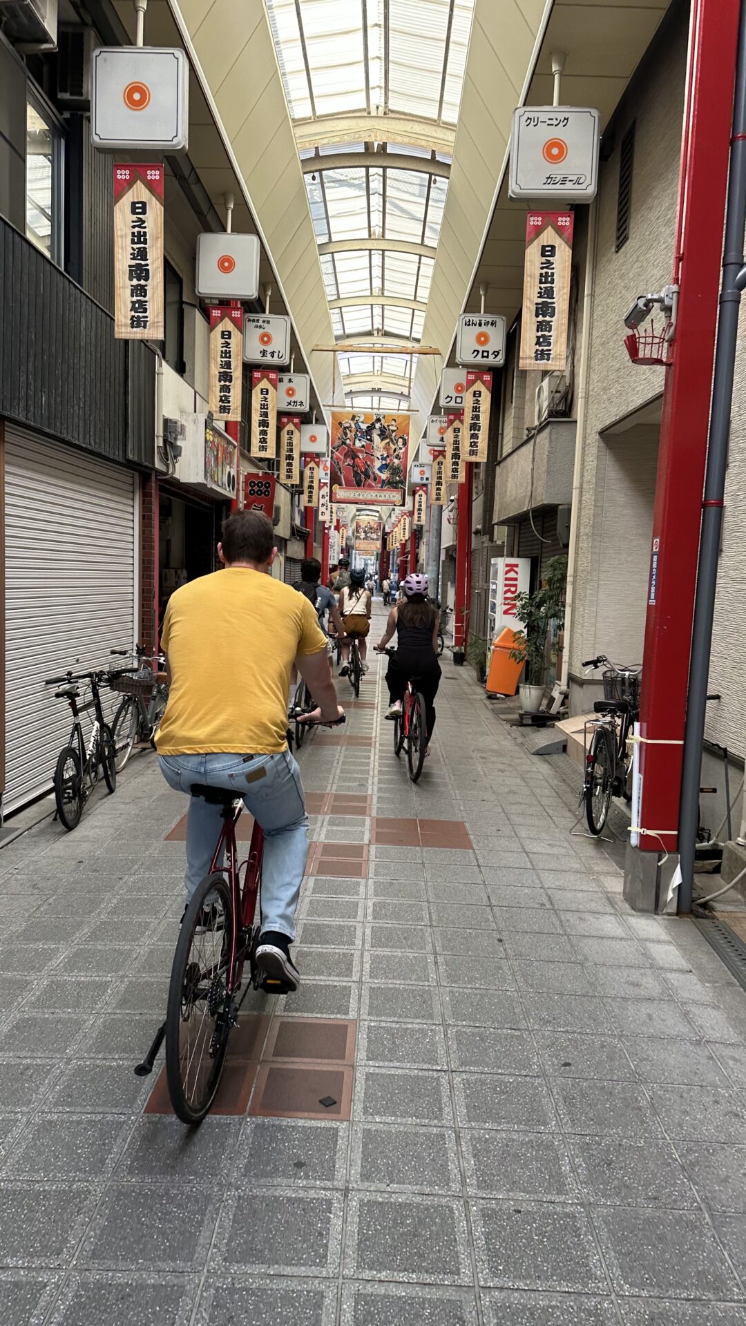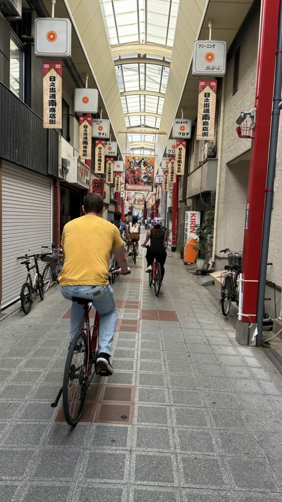 Danic takes us out on the open road, and we quickly get a feel for his style of tour. His attitude is firmly in the camp that it will all work out in the end. Nothing was out of control or dangerous, but there was less oversight than on other tours. Biking in urban Osaka involves transitioning from the pedestrian sidewalk to the road to a back alley, to a narrow shopping street. It can be a lot to navigate if you aren’t prepared. Good news! Everyone in our group is handling it pretty well.