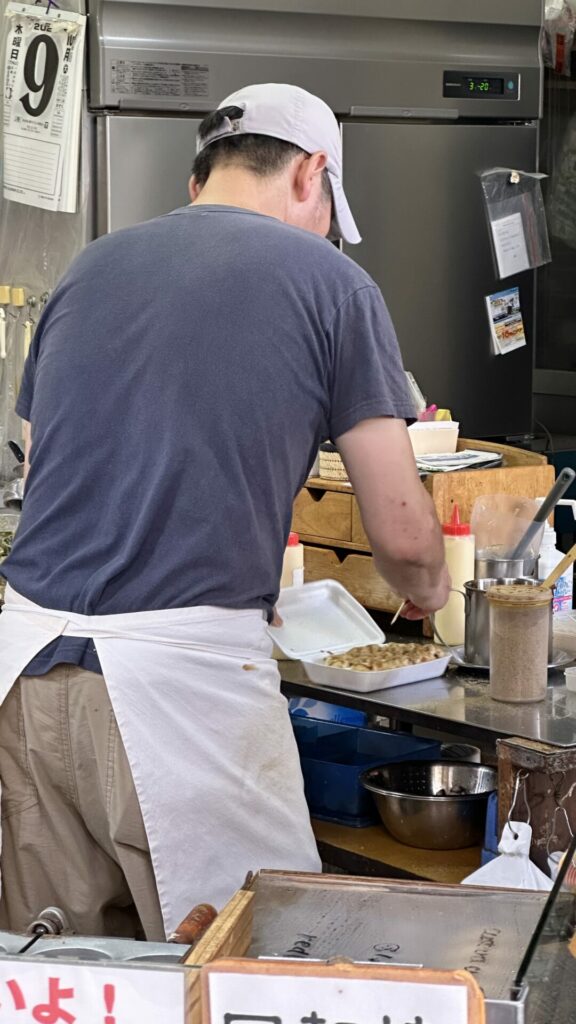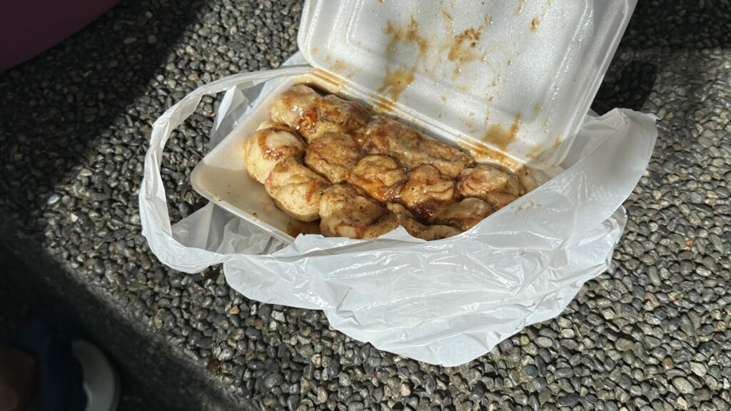 Our last food stop was at one of the lower parks on the castle grounds, where we indulged in Takoyaki. Takoyaki is a wheat flour ball-shaped snack that contains diced octopus served with a covering of mayonnaise and a reduced Worcestershire sauce.