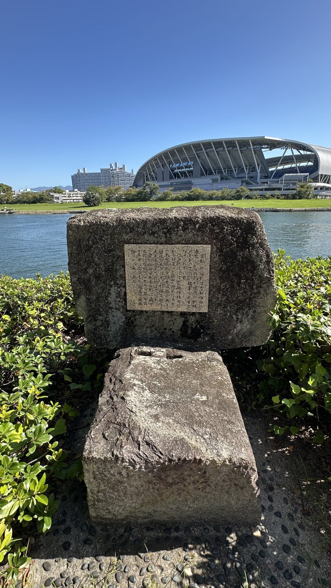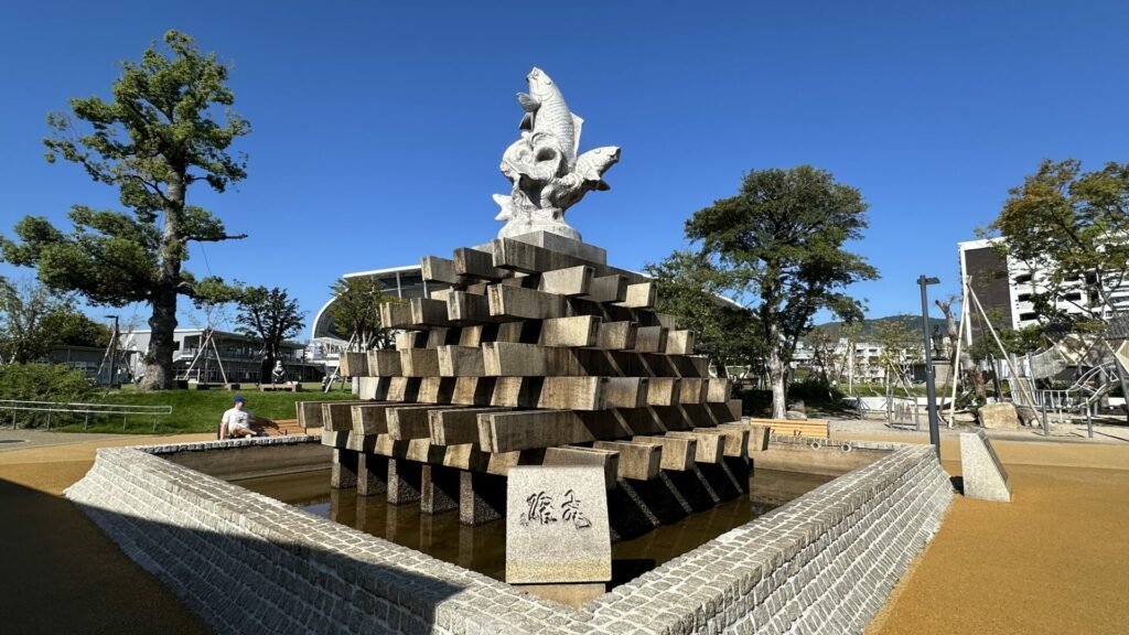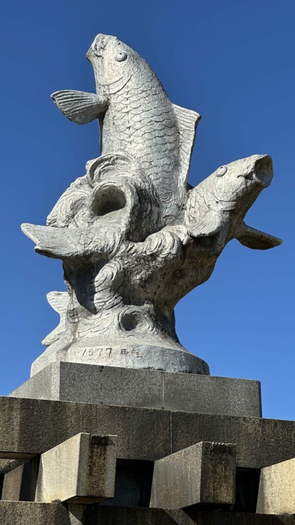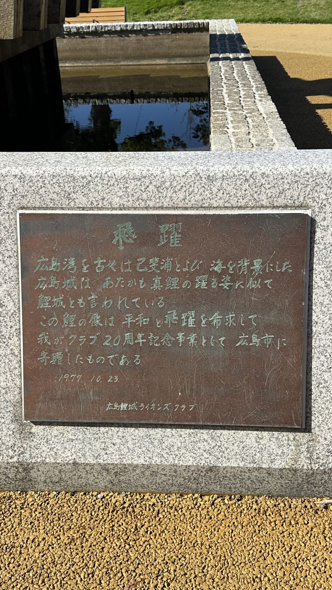 We left the castle complex and headed towards the Buddhist temple. We approached a stadium, not the super cool Vroom Vroom stadium, but another one. I got sidetracked by a koi statue and convinced Chris to stop so I could take pictures of it. Turns out that Hiroshima Castle was originally called Koi Castle, at least according to the plaque at the bottom of the statue.