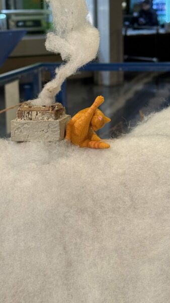 A cat cleaning its butt while sitting on the roof. Oh! And over there is Wile E. Coyote with a perfect Road Runner trap set up. Hold up, is that the leg lamp for sale in the antique store?!