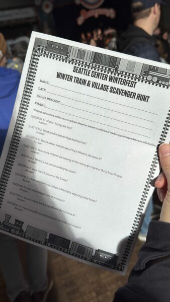The winter village is absolutely charming. It spans a huge section of the Seattle Center and is filled with a myriad of buildings, people, animals, and a diverse mix of characters getting up to good and bad. To encourage you to linger and fully explore the village, there are weekly scavenger hunts. Complete the hunt, turn in your form, and be entered to win a prize!