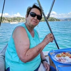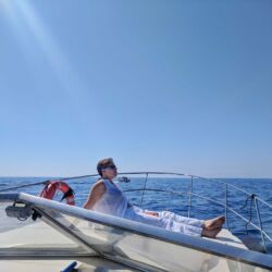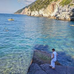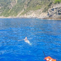 Nicola picked us up from the dock at Porto Venere and took us a little way into the sea where he anchored it to an established anchoring point. (There’s probably a nautical term for this) Nikola said we could sun bathe and swim while he and Maria prepared lunch. We all changed in the ships bathroom which was a challenge given the waves in the sea. Linda declined swimming and Nicola made sure she had a glass of wine.