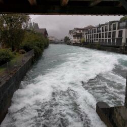 It was bound to happen sooner or later, rain. We knew we had a chance for rain all day today so our plan was to wander the town of Interlaken instead of ascending a mountain. Solid plan as the mountains are covered in clouds today but the light drizzle predicted by the weather app is more of a steady and chilly thing. We made it about a tenth of a mile to the dam and then choose to return to the warm and dry apartment (thank you Airbnb).